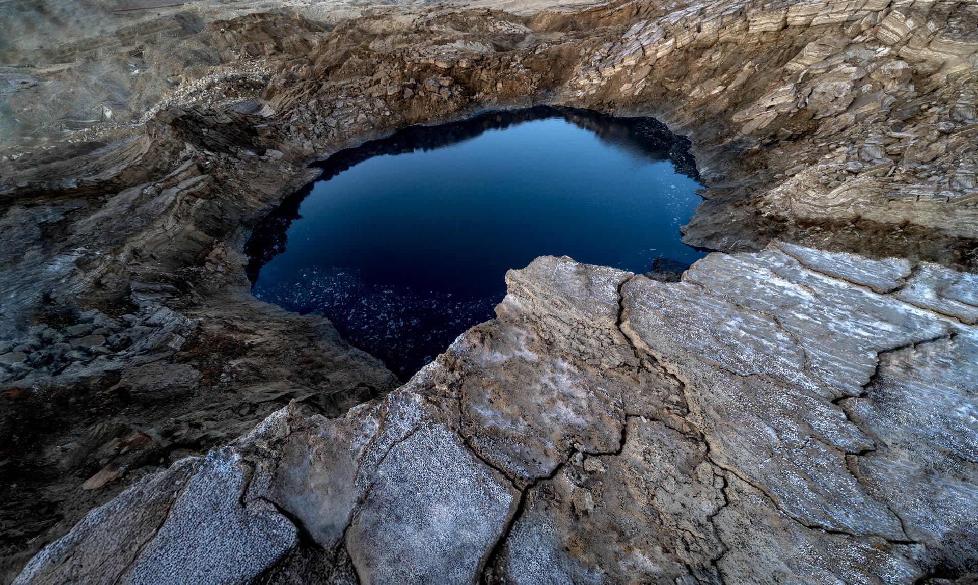 Thousands of sinkholes have formed due to the drying up of groundwater and the surrounding soil. Warning signs and fences now encircle most of the northern shore, where you can see abandoned date palm plantations, closed roads, and deserted buildings.